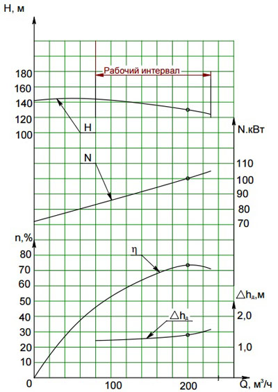 Подача, м3/ч: 200 Напор, м: 130 КПД насоса, %: 73,5 Давление на входе в насос, МПа (кгс/см2), не более: 0,69(7) Мощность электродвигателя, кВт: 132 Частота вращения, с-1 (об/мин): 50(3000) Род тока: переменный Напряжение, В: 380 Частота тока, Гц: 50 Масса агрегата, кг: 1770Характеристика насоса