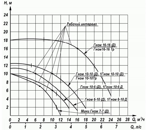 Параметры энергопитания: 1~220 В Ток, А: 3 Номинальная мощность электродвигателя, кВт: 0,6 Подача, м3/ч: 7 Напор, м: 7 КПД, %, не менее: 30 Масса, кг, без шнура питания, не более: 15Характеристика насоса