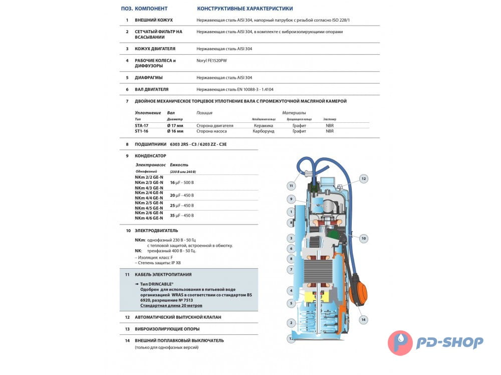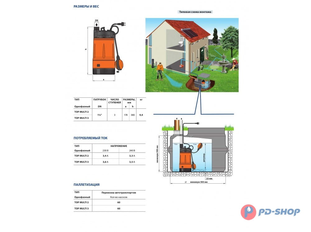 Серия ТОР MULTI включает в себя погружные дренажные электронасосы, центробежного типа с открытым рабочим колесом, разработанные для функционирования в автоматическом режиме. Рабочее колесо, качающееся на ведущем валу, состоит из заднего диска и из лопаток. Через всасывающую решетку жидкость входит во вращающийся лопаточный канал; здесь жидкость приобретает радиальное движение по направлению от центра к периферии, в процессе которого приобретает энергию как в виде давления, так и в виде увеличения скорости потока. На выходе из рабочего колеса жидкость устремляется в спираль, после преобразования части кинетической энергии в энергию напора, покидает насос через вертикально установленный патрубок подачи, предусмотренный в нагнетательном корпусе. Достаточное охлаждение двигателя обеспечивается перекачиваемой жидкостью.